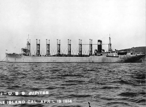 JUPITER was commissioned with a Navy crew, probably because of the experimental nature of her propulsion plant. On 9 Dec 12 the Navy Department had directed that "on all auxiliary vessels, except destroyer tenders and submarine tenders, the authorized battery is not to be installed but the foundations and holding down bolts are to be fitted and the guns provided and held in reserve," but on 13 Mar 15 SecNav rescinded these instructions and instead directed that "in future the batteries of auxiliaries manned by civilian crews will be held in reserve as heretofore, but the batteries of auxiliaries manned by naval crews will be mounted and in place." This directive in effect required mounting guns on FULTON, VESTAL, PROMETHEUS, JUPITER, NEPTUNE, BRIDGE, and HENDERSON.