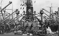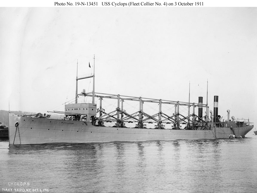 A clamshell bucket is dumping coal on the deck of the battleship while another bucket is in operation further aft. The battleship's entire crew is trying to shovel the heaps of coal on deck into chutes leading to the coal bunkers below. Each bucket carried 4,000 pounds of coal. Cyclops could operate twelve buckets at once, one for each of the collier's cargo coal holds.