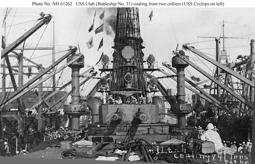 Viewed looking forward from atop # 4 12" gun turret while coaling simultaneously from two colliers at the rate of 841 tons per hour prior to World War I. The ship's band is stationed on top of # 3 turret. The two colliers are Cyclops (Fuel Ship No. 4) on the left and either Orion (No. 11) or Jason (No. 12) on the right. Cyclops had Mead-Morrison coal handling gear while the other collier had Lidgerwood gear.