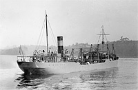 The collier's port side booms are raised over her cargo hatches and her starboard booms are extended over the receiving ship, the normal mode of operation for the Lidgerwood Marine Transfer system as installed in this class.