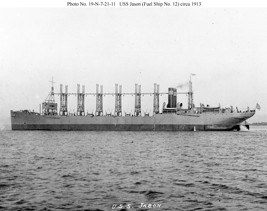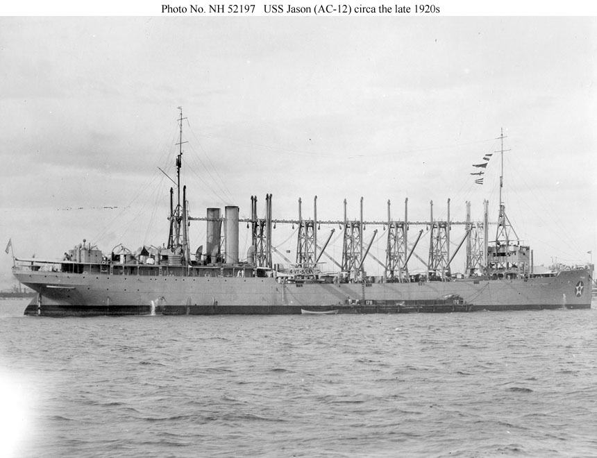 Torpedo and Bombing Squadron 20 with its six aircraft arrived at Manila in February 1924 and was redesignated VT-5A during 1927. Jason replaced Ajax (AG-15, ex AC-14) as its tender in May 1925. Note the large aviation star on the collier's bow.