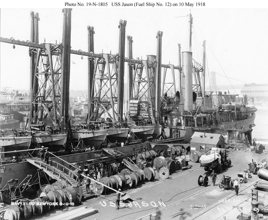 At the New York Navy Yard on 10 May 1918 loading aviation material for transportation to Inverness, Scotland.
