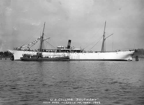 On 12 Mar 98 the U.S. Secretary of the Navy appointed a Naval Board on Auxiliary Cruisers to select and purchase civilian vessels for Navy use in the impending war with Spain. The Board initially focused on potential auxiliary cruisers and on tugs and yachts, but by the end of March it also had orders to find six colliers, two repair ships, and two distilling ships. On 11 Apr 98 three members of the Board inspected the British steamship SOUTHERY at Erie Basin, Brooklyn, and although English-built and flying the English flag, she was considered suitable and was purchased. The New York Times reported the next day that her purchase would complete the fleet of colliers according to the present plans. The others were SATURN, LEBANON, NIAGARA, STERLING, and MERRIMAC. At the end of April the Department instructed the Board to find more colliers, and ultimately between 2 Apr 98 (SATURN) and 30 Jun 98 (NERO) the Navy acquired twenty ships for use as colliers plus three more as distilling ships and one as a repair ship.