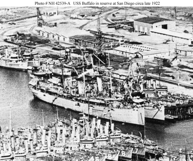 In "Red Lead Row" at the Destroyer Base, San Diego, California, at the end of 1922. The similar ship behind her is USS Prairie (AD-5).