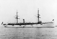 She is in her original configuration as an auxiliary cruiser with a main battery of ten 6" guns, including two on deck forward, probably two more aft, and six in the hull, plus two pole masts with fore-and-aft rig.