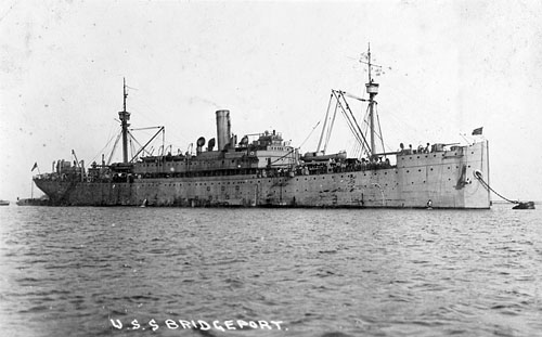 BRIDGEPORT sailed for Bermuda 6 Apr 18, escorted a convoy of 30 subchasers and 6 seagoing tugs from there to the Azores, and then returned to the U.S. on 29 May. She departed again on 28 June with a convoy of 18 subchasers and 6 seagoing tugs and arrived at Brest 5 Aug 18. There she was designated "parent ship" for 32 destroyers while, with PROMETHEUS (later AR-3), she also acted as a base repair and supply ship for patrol craft and visiting troop transports and cargo ships. She finally departed Brest on 15 Oct 19 and arrived at the New York Navy Yard on 11 Nov 19. Attached to Destroyer Squadron 3, Flotilla 2, Destroyer Force Atlantic on 1 Jan 20, she made a winter cruise to Guantanamo Bay and then received a refit at the Boston Navy Yard between 1 Jun 20 and 20 Aug 20 that included the upgrading of her armament. Still apparently considered a repair and supply ship, she was designated a repair ship (AR-2) when the Navy's standard hull classification scheme was implemented on 17 Jul 20, but her continued assignment to the destroyer force caused her to be reclassified as a destroyer tender (AD-10) in July 1921. In September 1924 the newly completed tender WHITNEY (AD-4) replaced BRIDGEPORT as tender to one of the Scouting Fleet's two destroyer squadrons, Desron 9, in the Atlantic. BRIDGEPORT's crew was transferred to WHITNEY and BRIDGEPORT was placed out of commission on 3 Nov 24 at the Boston Navy Yard.