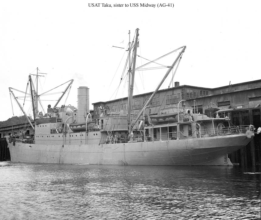 The sister of USS Midway (AG-41, ex S.S. Tyee). She is probably shown here soon after being acquired and renamed Taku in 1939 by the Alaska Transportation Co.
