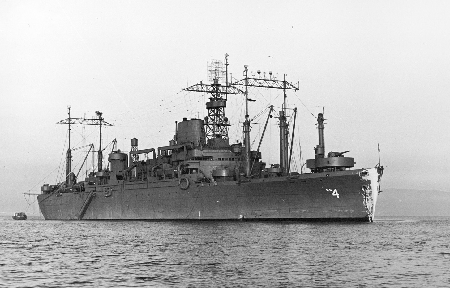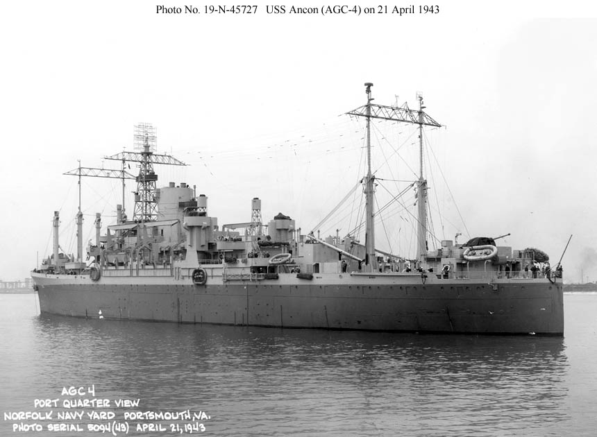 Photographed by the Norfolk Navy Yard on 21 April 1943 soon after her AGC conversion.