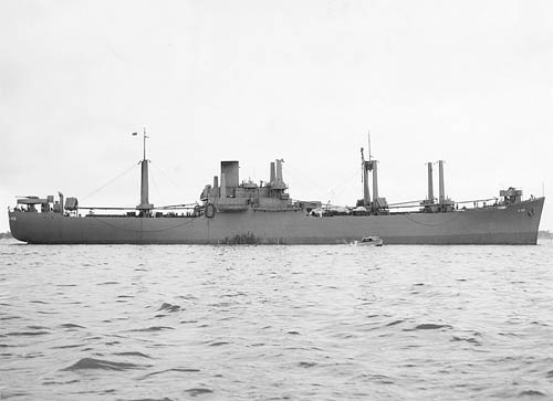 MERCURY (AK-42) received an armament of 2-3"/50 (one forward and one aft) and 8 anti-aircraft machine guns at the Charleston, S.C., Navy Yard between 23 and 26 January 1942. In May 1942 MERCURY's travels took her to San Francisco, which was outside the operating area of Agwilines and where an inspection showed that her armament was in unsatisfactory condition. The Navy initially planned to find her another commercial operating agent for operations in the Pacific but ended up instead placing her in commission with a Navy crew after an overhaul during which her crew accommodations were expanded and her armament was upgraded to include a 5"/51 instead of the after 3"/50 and 8-20mm guns in place of her machine guns. For one of her cargo runs temporary deckhouses to accommodate passengers were added on either side of hatch no. 4 aft of the superstructure, and she retained these for the rest of the war. Operational control of AK-42 was passed to ComServPac in January 1944 for service with the 5th Amphibious Force and she subsequently supported several major amphibious assault operations by carrying both troops and their equipment to landing sites. In February 1945 she was reassigned to ComServRon Ten and was ordered to be fitted as a GSK (General Stores) issue ship with the capability to transfer the stores at sea. To accomplish this all obstructions on the tops of her cargo hatches and adjoining deck areas, including all but one of her LCM and LCVP landing craft, had to be removed to provide adequate working space for the transfer at sea crews. After these improvised modifications were carried out at Ulithi, AK-42 replenished fast task groups at sea between March and May 1945. The ship began a full conversion to an AKS (Stores Issue Ship) with underway replenishment capability at the Hurley Marine Works, Oakland, Calif., in June 1945 and was reclassified AKS-20 effective 30 Jul 45. During this conversion her armament was finally upgraded to the standard for naval auxiliaries, 1-5"/38 and 4-3"/50, two 40mm twin mounts may also have been fitted, and her 20mm guns were redistributed to help clear the main deck of obstructions. The conversion was completed in September 1945 and MERCURY then saw continuous active service in the Atlantic Fleet until being decommissioned in 1959.