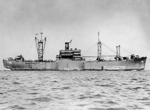 Accepted 25 Jan 45, ferry comm. to 27 Jan 45. Converted by NYd Charleston (S.C.). Commissioning also recorded as 25 Feb 45. Stk. 23 Jun 47, decomm. and to MC and NDRF 21 May 47. Contract of sale to Isbrandtsen Co., Inc., signed 18 Dec 47, out of NDRF 30 Dec 47, approval of this sale rescinded by MC 17 Aug 48 and ship returned to NDRF 26 Aug 48. Reinst. 17 Jul 51, from MC 24 Sep 51. To LKA-103 1 Jan 69. To NDRF 12 Aug 71, to Florida for use as a fish reef 23 Sep 87, delivered by MA 5 May 88. |