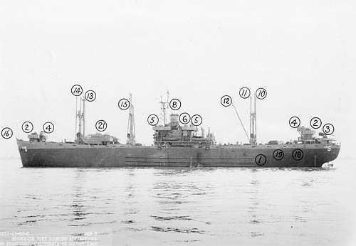 The day after her commissioning on 27 Feb 44, ZEBRA was drydocked in ABSD-1. There it was determined that the torpedo had caused sufficient damage to necessitate the construction of an entirely new number three hold. Two months were needed to complete this large job, and while it was being done the ship was reconfigured to accommodate a much larger crew, as was standard Navy practice, than had been needed to operate her as a merchant ship under WSA. After an additional fitting out period in Segond Channel, ZEBRA began operations as a net handling ship on 1 Jun 44. She proceeded to have a very active operational career in the Pacific that included two additional conversion periods, at Pearl Harbor in December 1944 and January 1945 and at Oakland, California, from May to July 1945.