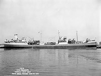 At the Norfolk Navy Yard on 23 March 1943 preparing for a voyage to Europe with a deck load including four PT boats.