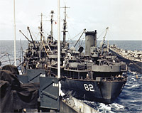 Refueling USS Iowa (BB-61) and an Essex class carrier (either Ticonderoga, Randolph, or Shangri-La) in the Pacific in 1945.