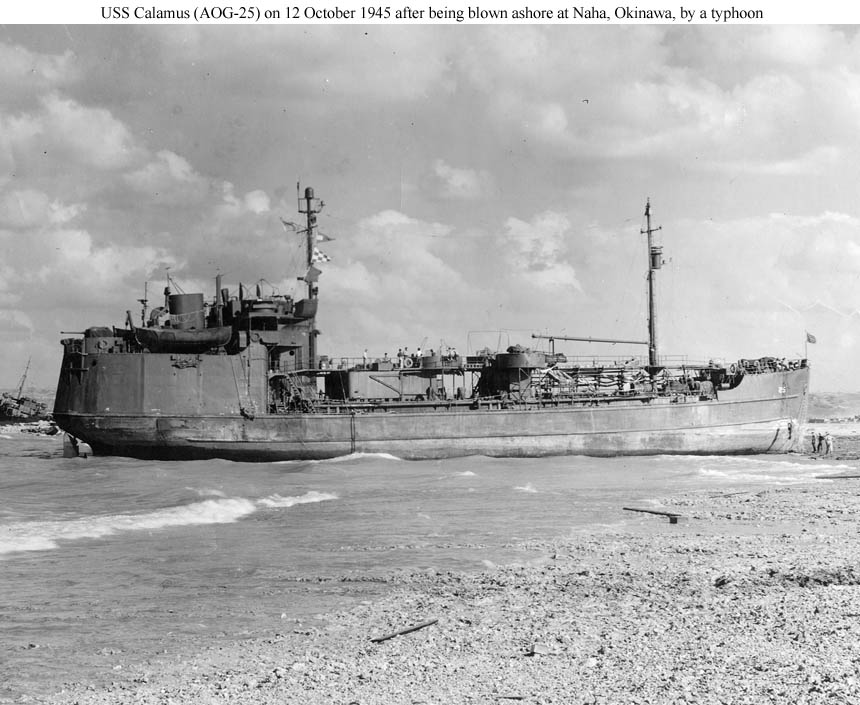 Unlike her sisters Sheepscot (AOG-24) and Sacandaga (AOG-40), which were destroyed in place after being wrecked in typhoons, Calamus was refloated within about three weeks and fully repaired.