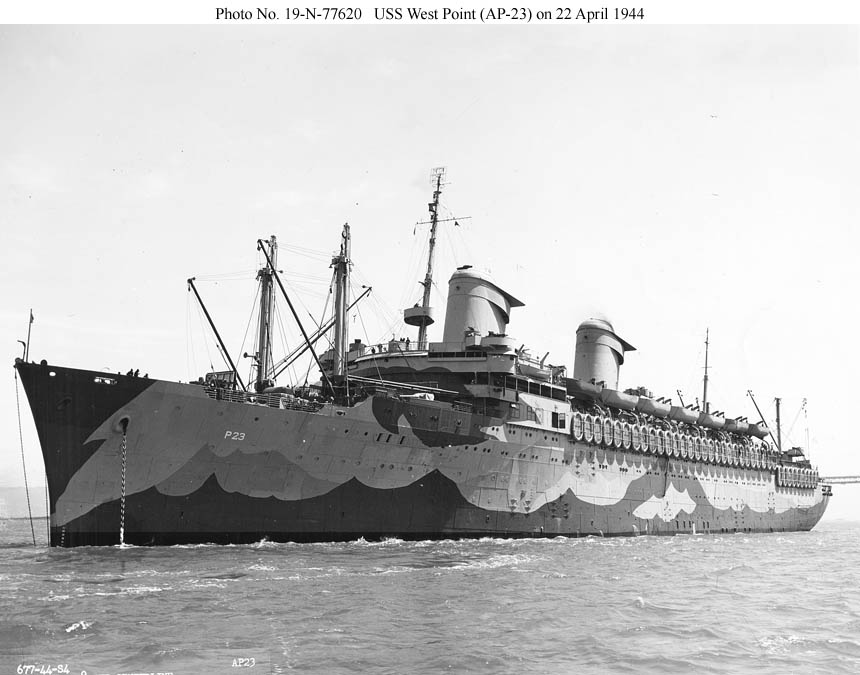 Banners hanging from her superstructure identify the following U.S. Army units (from left to right): Fifth Corps; 347th Infantry Regiment; and 87th Infantry Division. Note West Point's pattern camouflage.