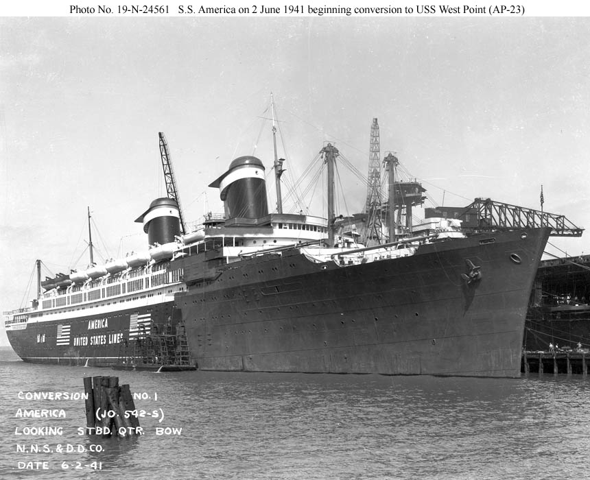 Shown on 2 June 1941 beginning conversion to USS West Point (AP-23).