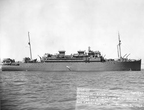 FY 1942. Between 1929 and 1935 the French Messageries Maritimes shipping firm built at La Ciotat three passenger and cargo ships for its Indian Ocean service: JEAN LABORDE (1929), MARECHAL JOFFRE (1931), and PRESIDENT DOUMER (1936). Their twin short rectangular smokestacks were of a type favored at the time by Messageries Maritimes for its diesel-propelled ships. In 1936-38 their diesel engines were supercharged to increase their speed from 16.5 to 19 knots and they were reassigned to the Far East service. MARECHAL JOFFRE was at Manila on 7 Dec 41 and was requisitioned there by the Free French and taken under protective custody by the U.S. Navy. The Navy put a crew on her and sent her under escort on 18 Dec 41 to Balikpapan and then to Darwin, Australia, where she was attacked by torpedoes on 23 Jan 42 just before her departure to Sydney. By special arrangement the ship then hoisted the U.S. flag and departed Sydney for the United States on 24 Mar 42 under the command of an American naval officer. In a conference on 3 Apr 42 between representatives of the Departments of Justice, State, Navy, and the War Shipping Administration, it was agreed that WSA would use its authority under an Act and an Executive Order of 6 Jun 41 to take possession of this foreign flag ship upon her arrival in a U.S. port and deliver her to the Navy for operation.