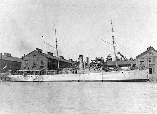 When the U.S. gunboat PETREL was sent into the inner harbor (Bakor Bay) at Cavite after the Battle of Manila Bay on 1 May 98 to destroy the Spanish gunboats there, she found one vessel unhurt, the transport MANILA. This ship lay in three feet of mud near the navy-yard, and her officers begged that she not be destroyed because she was unarmed and was a coast survey vessel. She was spared and on 4 May 98 the Americans towed her off, raised steam on her, and anchored her near the squadron. She proved to be a handsome steamer of about two thousand tons and was laden with supplies and five hundred tons of coal, from which the cruiser RALEIGH supplied her bunkers. Taken into the U.S. Navy, she was first commissioned on 20 Jul 98 and attached to the Asiatic Station. During the Philippine Insurrection she was actively engaged in patrol duty, convoying troops, cruising on station, etc. She participated in the bombardment of San Fabian on 7-9 Nov 99 and sent a landing party ashore on 16 Nov 99 during the taking of Zamboanga. She was station ship at Cavite during the second quarter of 1901 and the first quarter of 1902 and was at Mare Island by 30 Jun 02. She was placed out of commission at Mare Island on 1 Jul 03.
