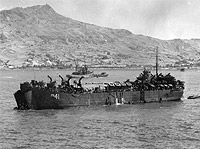 She is serving as administrative flagship for Commander, Naval Forces, Ryukyus, providing berthing and messing for 140 men. Note the quonset hut on deck and the open bow doors, possibly with an amphibious vehicle (LVT) exiting or entering.