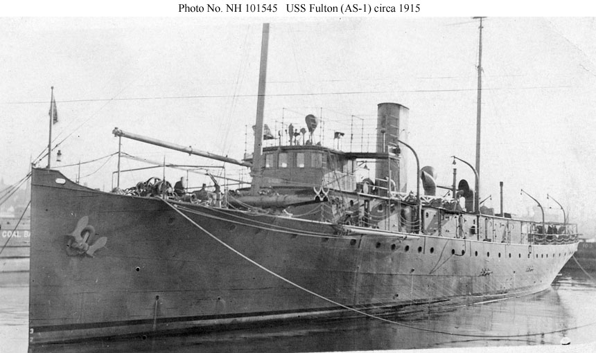 The sub with her radio mast raised is probably the Lake-type L-8, the other three are Holland-type boats just before deploying to Europe. Fulton now has two 3"/50 guns on the forecastle in place of the torpedo tubes.