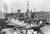 At the Naval Receiving Station, Pier 92, New York City. Camden, on the right, served as a barracks ship and provided steam and power to Seattle and the facilities on the pier.