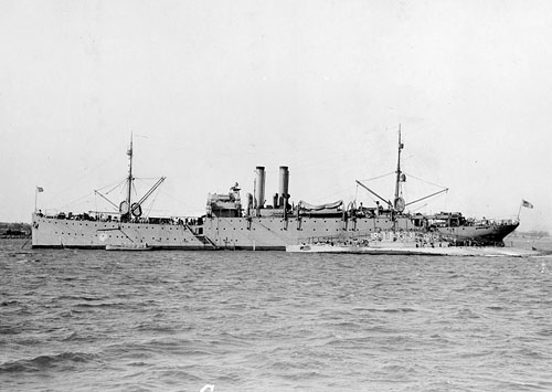 This ship was built as the freighter KIEL for the German-Australian Steamship Co., which operated in the cargo trade to Australia and the Dutch East Indies and later to North and South America. Eight sisters were built by the same shipyard for the same buyer between 1897 and 1901: MEISSEN, BIELEFELD, VARZIN, HARBURG, ITZEHOE, MAGDEBURG, DUISBURG, and LAEISZ. (HARBURG and MAGDEBURG became the U.S. merchantmen PAWNEE and NEUSE in 1917.) The British-built BERGEDORF and OFFENBACH (both 1900) may also have been sisters. The MEISSEN class had two separate boiler rooms, each with its own smokestack, in order to produce the high speed desired (KIEL developed 14 knots on trials). KIEL was interned at Southport, N.C., with the freighter NICARIA (later USS PENSACOLA), and the two ships were seized there upon U.S. entry into the war in 1917. On 2 May 17 the Charleston Navy Yard was directed to make arrangements with the Collector of Customs at Pensacola to take over NICARIA and make necessary repairs, and on 5 May the Bureaus were notified that repairs at the Charleston Navy Yard had been authorized. KIEL was one of eight ships ordered transferred by Presidential Executive Order 2625 of 22 May 17 from the Treasury Department to the Navy Department for use as collier and cargo carrier. She was one of the 13 seized German cargo ships that received Navy names from the Secretary of the Navy on 9 Jun 17, the others being the ships later designated AS-6, AS-8, and AK 1-10. Commissioned at Charleston 15 Aug 17 as a cargo ship, CAMDEN proceeded to Philadelphia for more repairs. Assigned to the Naval Overseas Transportation Service on 9 Jan 18, she left Philadelphia on 31 Jan 18 on a cargo voyage to the United Kingdom and returned to Philadelphia on 25 Apr 18. However the Navy Department had decided in October 1917 to use this ship as a submarine tender and she was decommissioned at Philadelphia on 3 May 18 and recommissioned on 21 Feb 19 after conversion. She retained her distinctive two smokestacks in this conversion but had her well deck forward filled in and new superstructures including a large midships island added.
