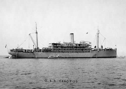 After temporary duty at Coco Solo, Canal Zone, CANOPUS was transferred to the Pacific in 1923 and became tender to Submarine Division 17, which consisited of six new "S" class subs (S-36 through S-41). When inclined at Mare Island on 27 Aug 24 her installed armament consisted of 2-5"/51 (1 forward at frame 17.5 and one aft at frame 149) and 4-3"/50 (2 at frame 65 and 2 at frame 100). In November 1924 the tender and the subs joined the Asiatic Fleet at Manila, and CANOPUS remained in the Far East for the remainder of her career. Just before December 1941 CANOPUS had finished an extensive overhaul at Cavite Navy Yard in which she received additional anti-aircraft machine guns and splinter protection around exposed positions. The ship moved from Cavite to the Manila port area on 8 Dec 41 and thus escaped damage in the devastating Japanese air attack on Cavite on 10 Dec 41. She moved to Mariveles Bay at the tip of Bataan on 25 Dec 41 and received damaging bomb hits on 29 Dec 41 and 6 Jan 42. The last of her submarines departed at the end of December but the tender continued to participate in the defense of Bataan until 8 Apr 42 when she was backed into deep water under her own power and scuttled to prevent capture.