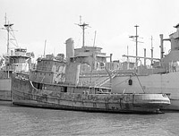 Her small 3" gun has been removed but she retains her two firefighting nozzles on the superstructure.