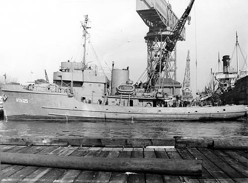 Ex AT-125 31 Jul 42, to ATA-125 15 May 44. To have been trf. to UK under Lend Lease as JUSTICE but retained by U.S. Sold (delivered) by MC to Diamond Construction Co., Washington, DC. Merc. JOSEPH H. MORAN II 1947, DRAGON 1949, JOSEPH H. MORAN II 1953, DRAGON 1959, UTRECHT 1960, HIPPOPOTAME (French Navy) 1964, sunk as target in Pacific 4 Apr 86, condemned and designated hulk Q-647 21 Apr 86. |