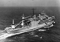 Photographed in the Azores on 21 August 1958 with her stern showing the extensive modifications made to enable her to handle the projected Martin P6M Seamaster flying boats. She was in the Azores to take scientific readings for Project ARGUS, atmospheric nuclear tests in the South Atlantic conducted from Norton Sound (AVM 1). Note the scientific equipment on her after deck.