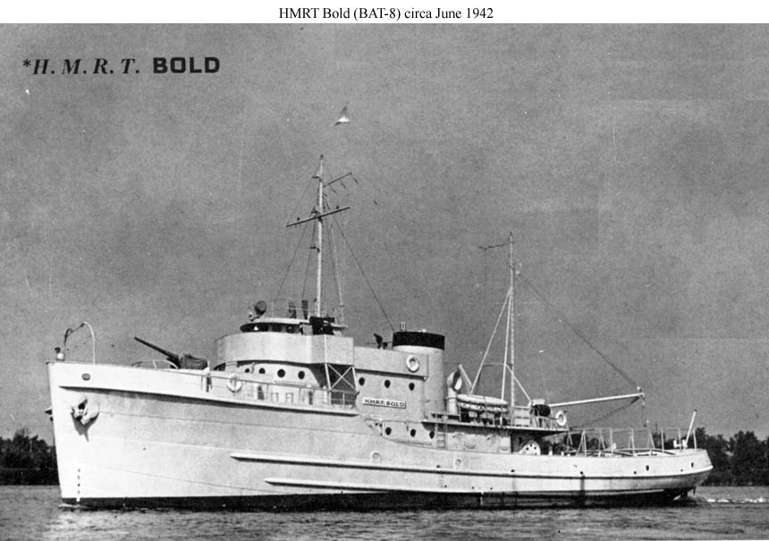 Note the clutter of towing gear on the after decks of these British tugs. USS Plunkett (DD-431) is in the background.