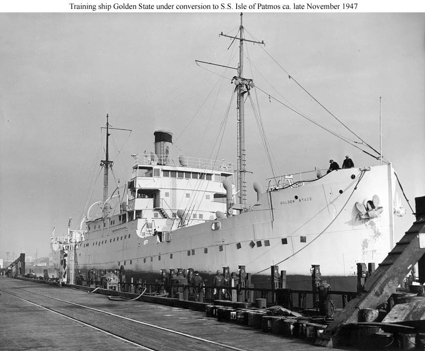 Coming out of drydock at the Bethlehem Steel Company's Alameda Repair Yard at the end of November 1947 during her outfitting for merchant service as S.S. Isle of Patmos.