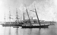 At the Boston Navy Yard in the summer of 1863 with the U.S. Practice Ship Marion (1839-1871) and, behind her, the line of battleship Ohio. America was serving as tender to Marion, a sailing sloop of war that acted as practice ship for the U.S. Naval Academy at Annapolis between 1862 and 1870, while Ohio was serving as receiving ship at the Boston Navy Yard.