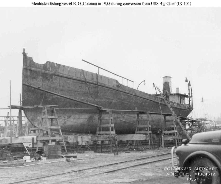 The former USS Big Chief (IX-101) in 1955 during conversion to a menhaden fishing vessel by Colonna's Shipyard, Inc., Norfolk, Va.