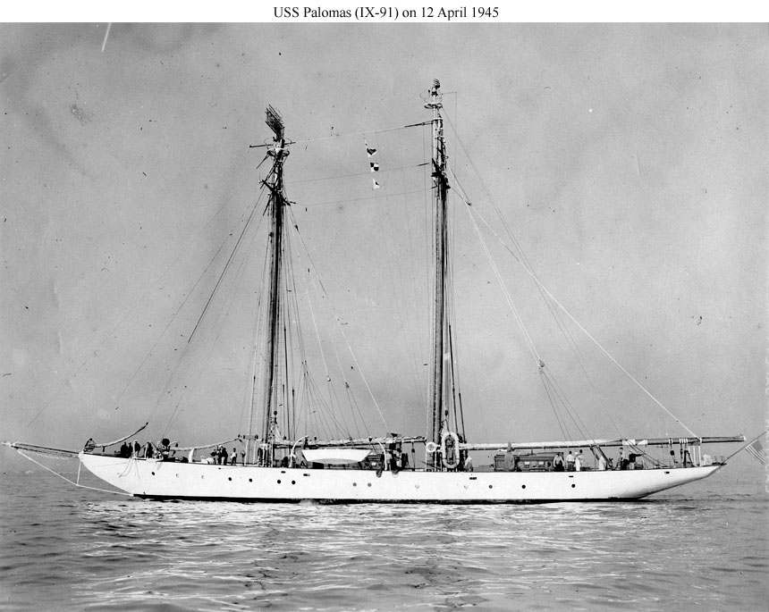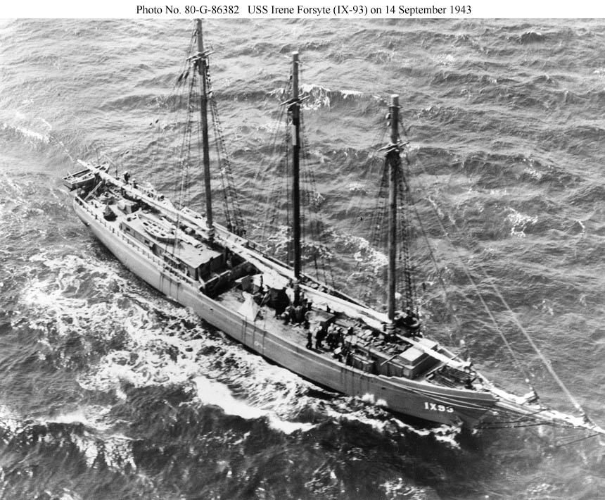 She was serving as radar training ship at Treasure Island, Calif., and had radar antennas at the tops of both of her masts.