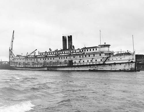 FY not assigned (acquired with BuShips maintenance funds). The inland passenger steamer RICHARD PECK was built in 1892 for the New Haven Steamboat Co., which operated her in Long Island Sound between New York City and New Haven. The attractive steamer was designed by the American marine artist Archibald Cary Smith, who also designed the 1881 America's Cup defender MISCHIEF. This twin-screw steel-hulled vessel was a big improvement over the firm's earlier wooden hulled side wheelers. Improved rail service to New Haven ended the steamship service to this port in 1918, but the ship, now operated by the New England Steamship Co. of New Haven, shifted to New London and then worked as a Sound excursion boat until World War II.
