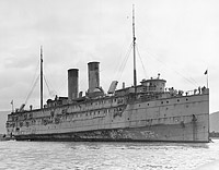 Shown after being chartered to the Admiral Line, whose markings are on the stacks, and before being acquired by the Navy in 1918.