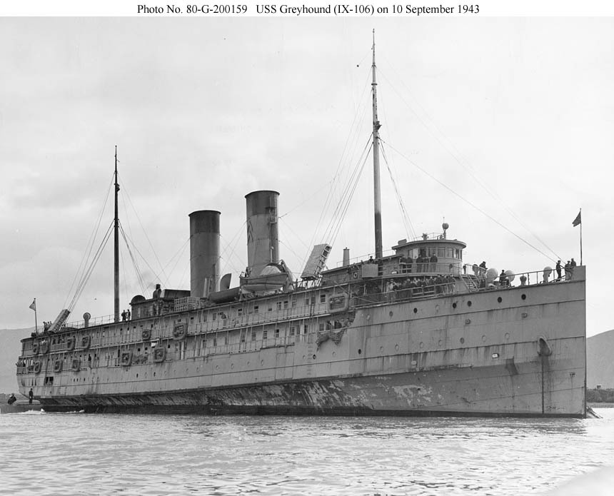 Photographed on 30 July 1943 at Kodiak, Alaska, four days after running shakedown trials after the refurbishment of her machinery and shortly before she was renamed USS Greyhound.