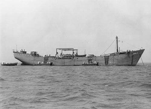 Ex merc. sail barkentine MARSALA, ex CITY OF VICKSBURG. Converted by Norfolk SB & DD Co. Grounded in a severe storm 14 Sep 44 near Norfolk and broke her back. Hulk laid up at the Convoy Escort Piers at Norfolk and officially abandoned 10 Dec 46. |