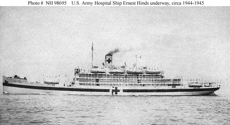During May 1942 - September 1943 Ernest Hinds operated as a transport, making a trip to Alaska in mid-1942 and thereafter carrying personnel and cargo between the U.S., Hawaii, and the south Pacific and within the latter region. The ship was converted to a hospital ship at San Francisco, California, between September 1943 and June 1944. She then steamed through the Panama Canal to begin service between the U.S. East Coast and the Mediterranean Sea. Ernest Hinds's hospital ship service ended in September 1945 and she was again altered to a transport. She carried Jamaican laborers between Florida and Jamaica on behalf of the War Shipping Administration until turned over to the U.S. Public Health Service in April 1946 for use as a floating isolation ward at Jacksonville, Florida. She was transferred to the Maritime Administration in April 1947 and laid up at Brunswick, Georgia. Moved to the James River, Virginia, Reserve Fleet in April 1948, the nearly forty-year-old ship was sold for scrapping in May 1957.