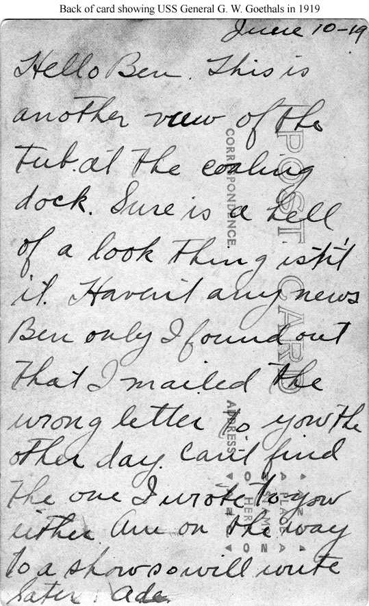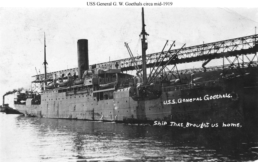 Photo #: Unknown USS General G.W. Goethals (ID # 1443) In an American port circa mid-1919 while bringing troops home from Europe. The reverse side of this post card dated 10 June 1919 on which the writer calls the ship a "tub" may be seen here. Donation of Dr. Mark Kulikowski, circa 2013. U.S. Naval History and Heritage Command Photograph. |