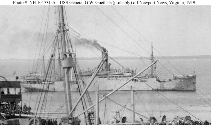 General G.W. Goethals, a 4707 gross ton passenger-cargo ship, was built at Hamburg, Germany, in 1911 as the German commercial steamer Grunewald. Later becoming a U.S. flag merchantman, she was taken over by the Navy in March 1919 and placed in commission as USS General G.W. Goethals (ID # 1443). As a troop transport assigned to the Cruiser and Transport Force, she was employed carrying U.S. service personnel home from France and taking cargo to Europe. The ship made three round-trip trans-Atlantic voyages for these purposes between April and August 1919, then carried supplies from the East Coast to the Gulf Coast, Caribbean and Panama. Decommissioned upon her return to New York in mid-September 1919, General G.W. Goethals was returned to her owner, the Panama Railroad Steamship Company.
