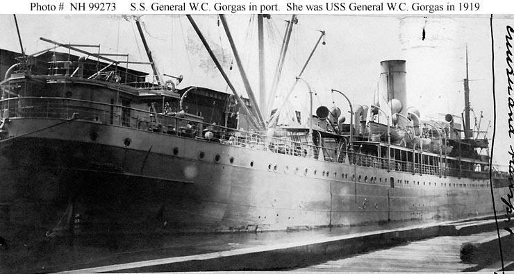 General W.C. Gorgas, a 4689 gross ton passenger-cargo ship, was built at Rostock, Germany, in 1902 as the German commercial steamer Prinz Sigismund. Seized by the U.S. Government when the United States entered World War I in April 1917, the renamed ship was thereafter operated by the Panama Railroad & Steamship Company carrying troops and war cargo to Europe. In March 1919 she was turned over to the U.S. Navy, placed in commission as USS General W.C. Gorgas (ID # 1365) and continued her work as a troop transport. Between late April and early July she made two round-trip voyages between the U.S. East Coast and France, bringing home more than 2000 military personnel. General W.C. Gorgas was decommissioned in late July 1919 and returned to the U.S. Shipping Board.