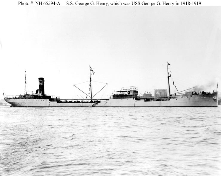 George G. Henry, a 6936 gross ton (10,500 tons displacement) tanker, was built at San Francisco, California, in 1917. In August 1918 Her owner, the Los Angeles Petroleum Transportation Company, chartered her to the U.S. Navy, which placed her in commission at that time as USS George G. Henry (ID # 1560). Late in that month she began her first trans-Atlantic voyage as a Navy ship, taking aviation gasoline and other cargo to France. While returning to the U.S. on 29 September 1918 she engaged in a running gun battle with the German submarine U-152. The tanker was able to escape, although she was hit by one enemy shell and near-missed by others, which set her afire and wounded several crewmen. Later in that trip, on 3 October, George G. Henry collided with and sank USS Herman Frasch (ID # 1617). Following repairs, she made four more voyages from the U.S. to France before being decommissioned and returned to her owner in May 1919.