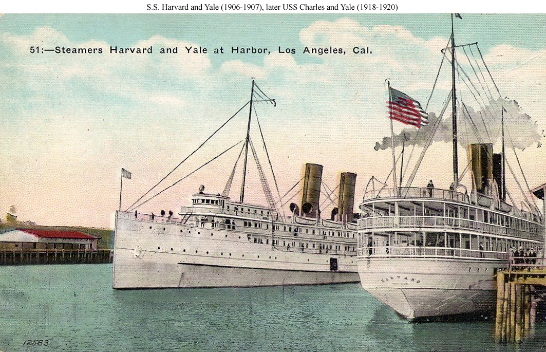 Photo #: None S.S. Harvard and Yale (American coastal passenger ships, 1906-1907) Shown in port at Los Angeles with buff colored smokestacks, a color used by H. F. Alexander's Admiral Line. Both ships were still registered in New York as indicated on Harvard's stern. Source: Navsource. |