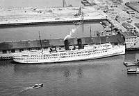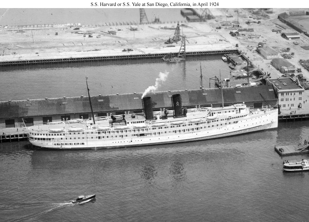 Photo #: None (color) S.S. Harvard or S.S. Yale (American coastal passenger ship, 1906-1907) At the Municipal Pier at San Diego in April 1924, the month in which service was increased from two to three visits a week. The ships would loop down from Los Angeles to San Diego, a resort town with liquor nearby in Mexico, and then proceed to San Francisco. Source: flickr, posted by the San Diego Air and Space Museum Archive. |