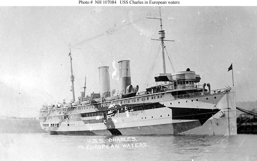 USS Charles, a 3731 gross ton coastal troop transport, was built in 1907 at Chester, Pennsylvania, as the passenger steamship Harvard. She was taken over by the Navy in March 1918 and placed in commission in early April as USS Harvard, a name that was changed to Charles a few days later. In June 1918, after fitting out at the Mare Island Navy Yard, California, the ship transited the Panama Canal and steamed to Hampton Roads, Virginia. She crossed the Atlantic to Brest, France, with a load of troops in July, then went to Southampton, England, to begin service carrying military personnel across the English Channel. Between late July 1918 and early May 1919 she was kept busy in that work. Returning to the U.S. in June 1919, Charles was sent to the Philadelphia Navy Yard, where she was placed out of commission a year later. Her name reverted to Harvard in July 1920 and, though considered for conversion to a seaplane tender, she was sold in October of that year. Returned to commercial employment as the S.S. Harvard, she was lost through stranding on 30 May 1931 at Point Arguello, California, a short distance from the place where seven U.S. Navy destroyers were wrecked on 8 September 1923.