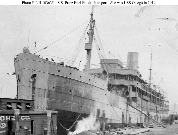 S.S. Prinz Eitel Friedrich, at 4650 gross ton passenger-cargo steamship, was built at Hamburg, Germany, in 1901 for commercial operation under the German flag. She was taken over by the U.S. Government during World War I, renamed Otsego and assigned the Navy registry ID # 1628. In February 1919 the U.S. Shipping Board turned the ship over to the Navy, which placed her in commission as USS Otsego. After conversion to a troop transport, the ship made four round-trip voyages between the U.S. and France, carrying military cargo eastbound and returning home with American veterans of the First World War. This work was completed in late August and, in mid-September 1919, Otsego was returned to the Shipping Board.
