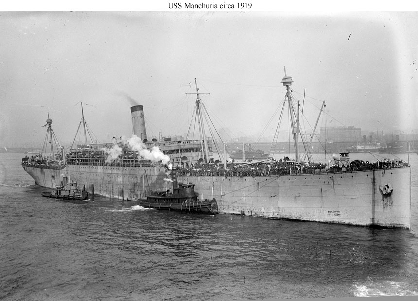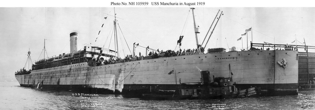 Photo #: NH 105959 USS Manchuria (ID # 1633) Arriving at New York on 25 August 1919 with troops from France including the 6th Engineers, the 5th Field Signal Battalion, and the 3rd Sanitary Train. Photographed by Head-Mayberry, 488 7th Ave., New York. Donation of Captain Stephen S. Roberts, USNR (Retired), 2009. U.S. Naval History and Heritage Command Photograph. |