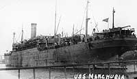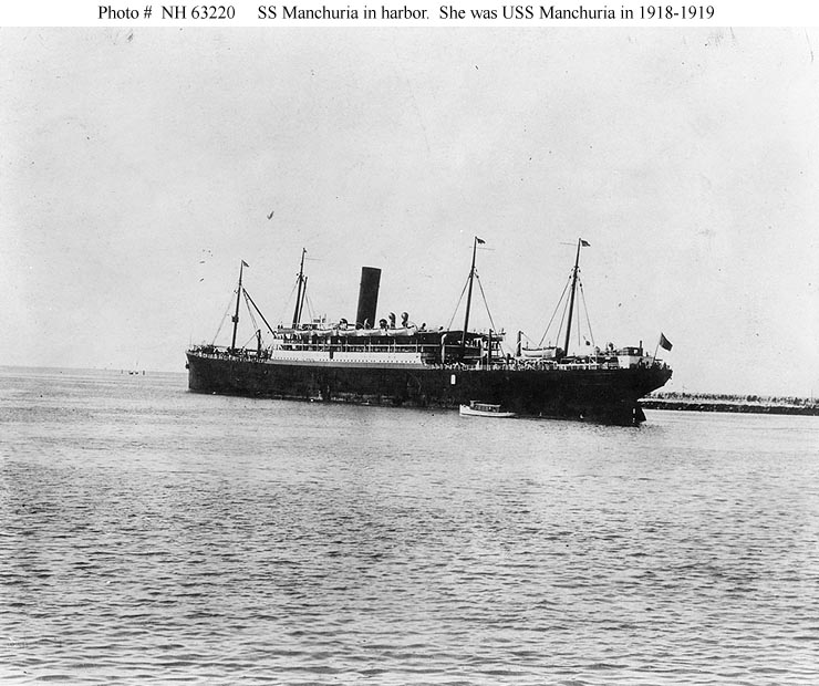 USS Manchuria, a 13,638 gross ton troop transport, was built at Camden, New Jersey, in 1904 as the commercial passenger steamer of the same name. She was taken over by the Navy in April 1918 and placed in commission later in that month. During the rest of World War I she made five voyages to France, carrying American service personnel to the European war zone. After the November 1918 Armistice ended the fighting, Manchuria began bringing veterans home, making nine trips from France to the United States for this purpose. The last of these ended at New York in late August 1919. The ship was decommissioned there in September and returned to her owner.